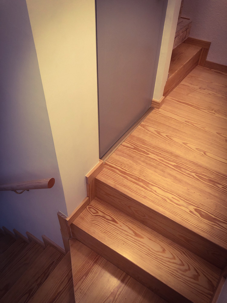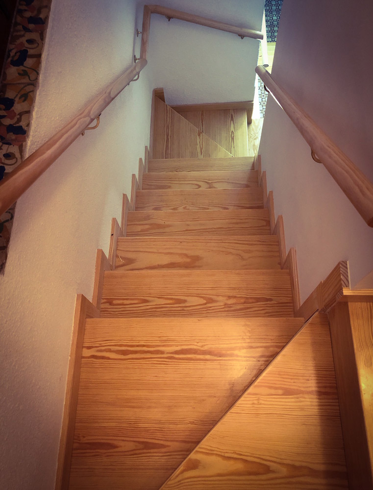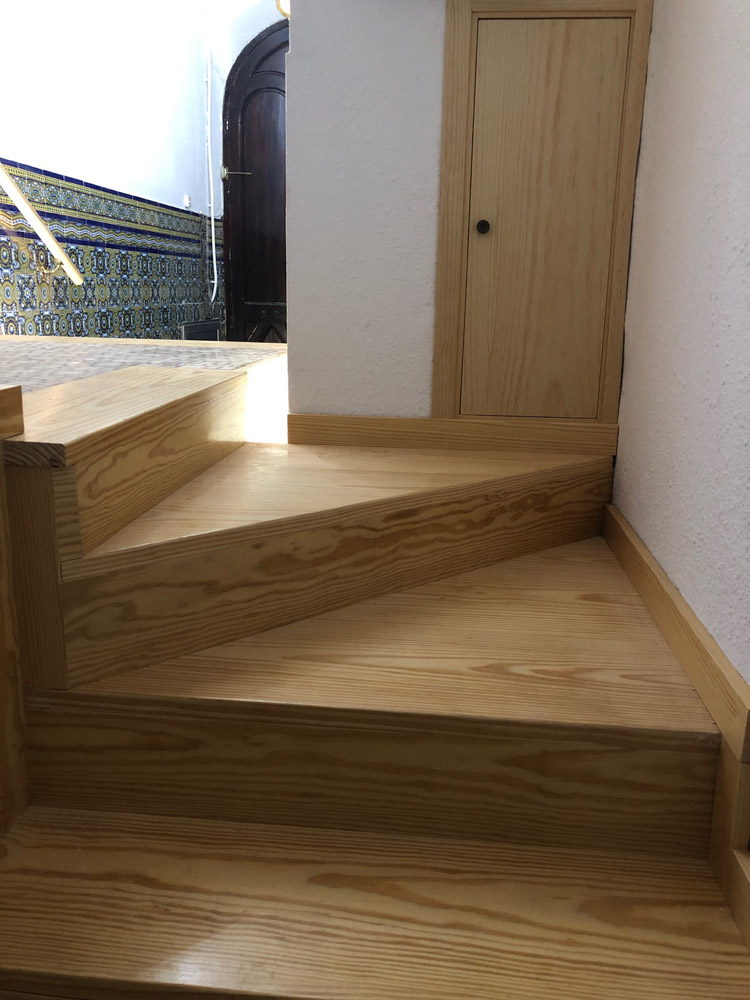 Para este trabajo se ha utilizado madera de pino maciza en huellas, tabicas y rodapié, así como madera de pino para los pasamanos.