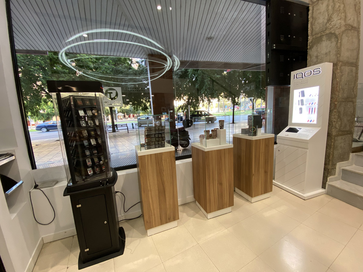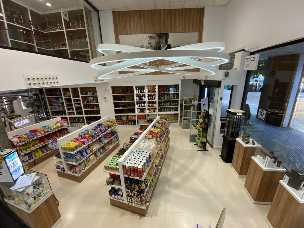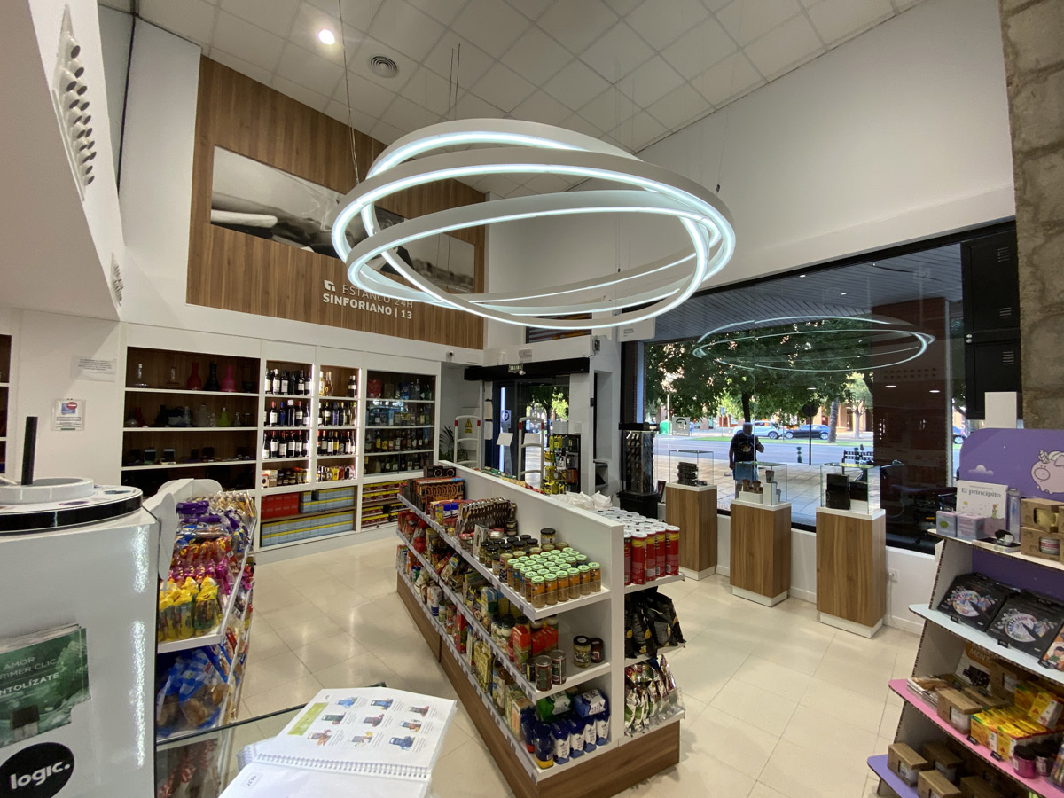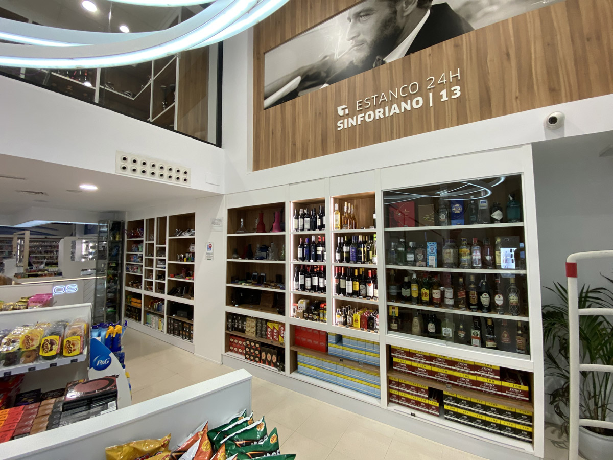 Mostrador, vitrinas, estanterías, islas, rótulos, iluminación… Hemos fabricado todo el mobiliario que conforman este local. El MDF lacado en blanco y el tablero de roble son los protagonistas en este concepto de estanco.