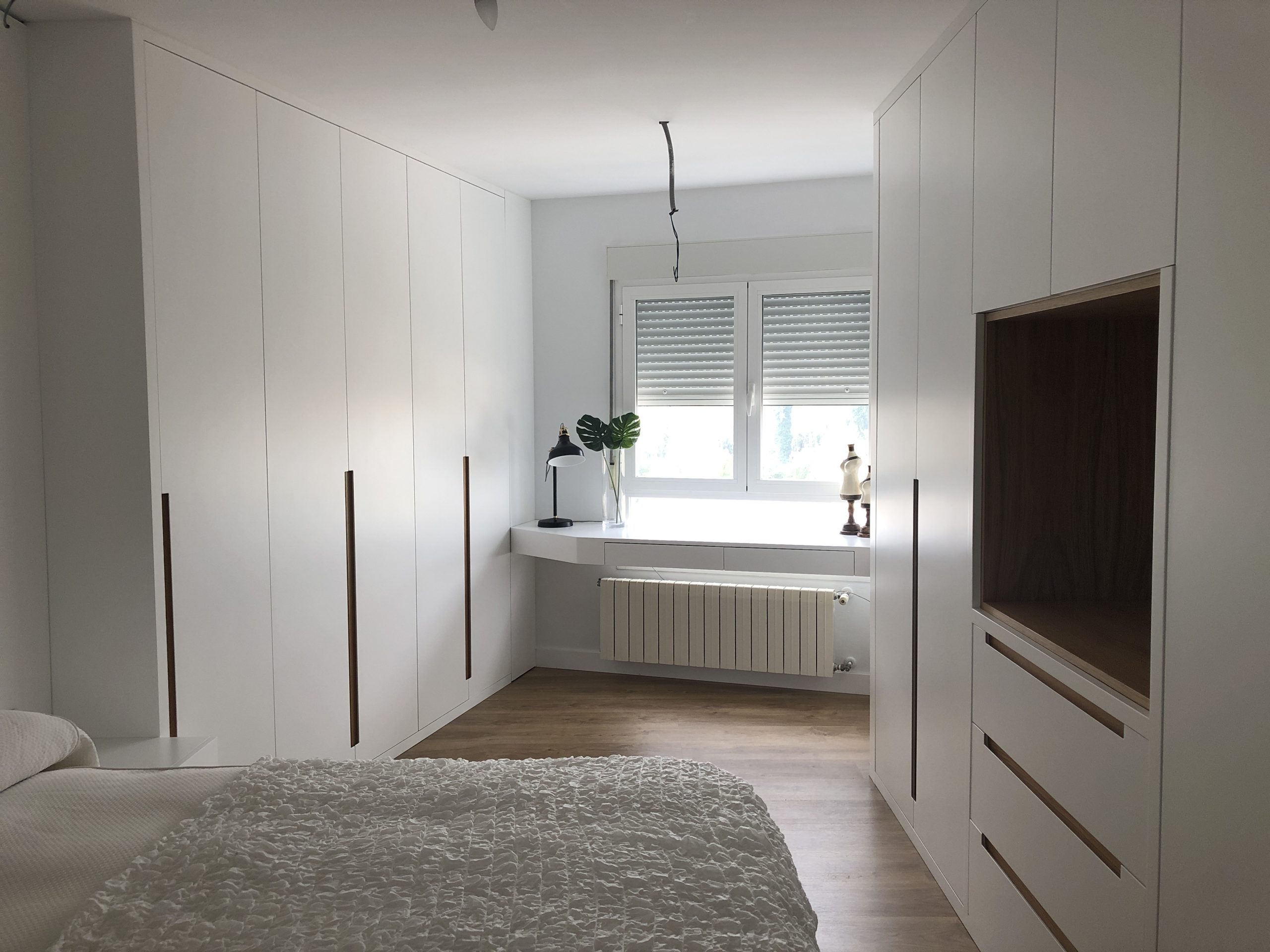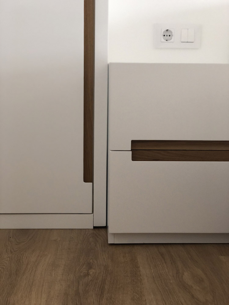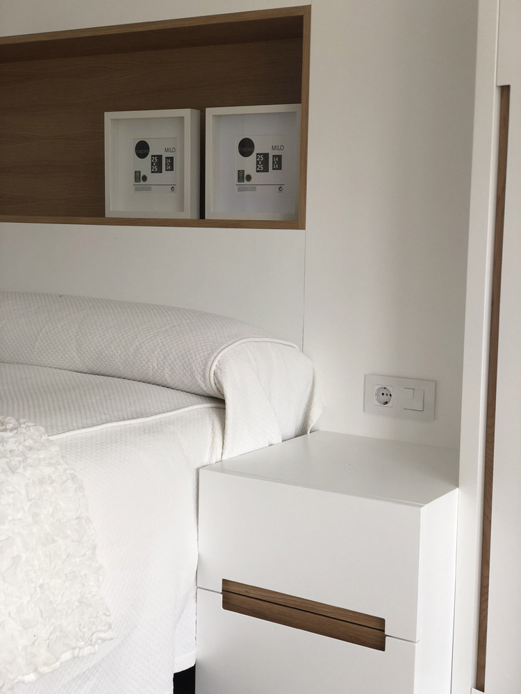 Para la fabricación de estos elementos se ha optado por MDF hidrófugo lacado en blanco por su versatilidad, añadiendo cajas en madera de roble en la zona del cabecero y zona de TV para crear contrastes. Los tiradores de puertas y cajones también en madera de roble crean armonía en todo el conjunto.