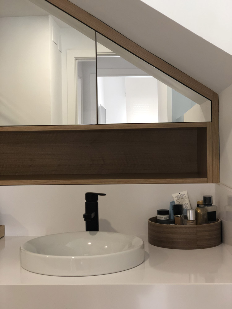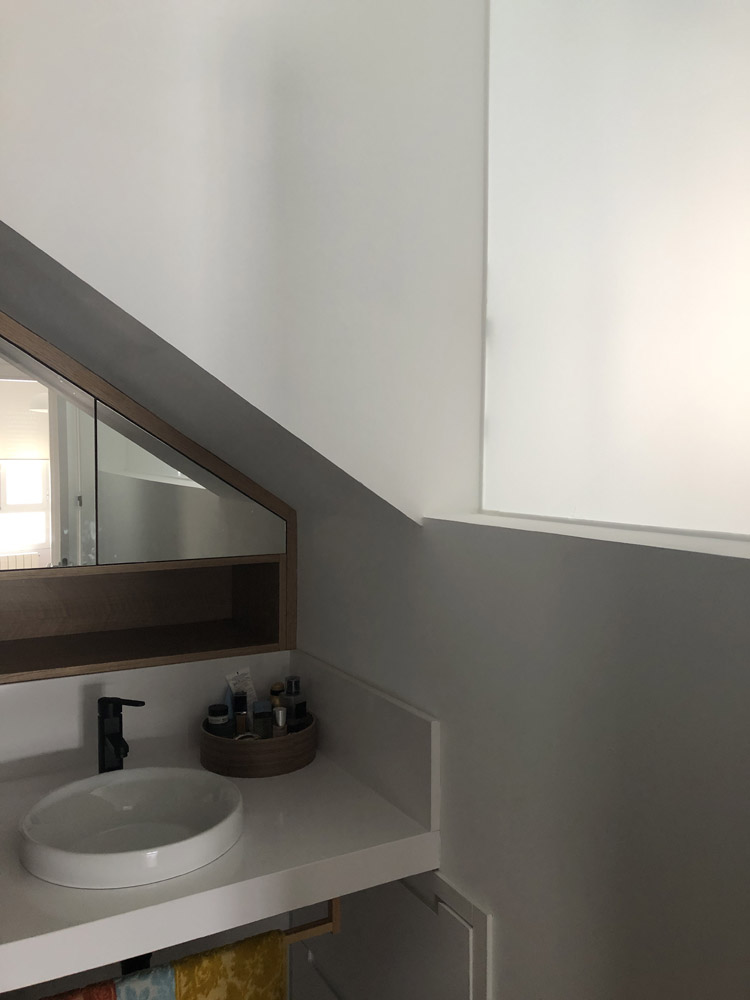 El mueble del baño ha sido fabricado para encajar en el hueco bajo escalera. El mueble, fabricado en madera de roble, es totalmente funcional y consta de cuatro puertas y un hueco inferior donde poder almacenar pequeños productos.